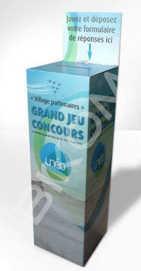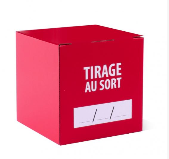 L’urne est une structure en carton le plus souvent carré, qui dispose d’une fente pour collecter des papiers, des objets ou des coupons. Il existe des modèles à poser sur un comptoir, sur une table ou bien des modèles plus hauts qui se posent sur le sol. Elles sont souvent utilisées dans le cadre de jeux concours ou de tirage au sort. Ce type de jeux, malgré l’arrivée du digital fonctionne très bien. Un tirage au sort c’est toujours un événement qui fait le buzz.