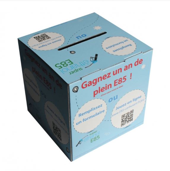 Chaque urne en carton peut répondre à plusieurs besoins spécifiques en communication. Ici nous allons présenter l’urne comme un moyen d’obtenir de nouveaux contacts en salon. Habillez votre comptoir de stand lors de salons professionnels avec une urne de taille moyenne, 20x20x20 ou 30x30x30. Ce type d’urne pliable est une richesse pour votre stand. Via la mise en place d’un jeu concours, vous aurez la possibilité de récolter les adresses mail de potentiels clients et ainsi d’enrichir votre base de données. Ici, le jeu concours associé à l’urne en carton est un vecteur direct d’accroissement de votre business.